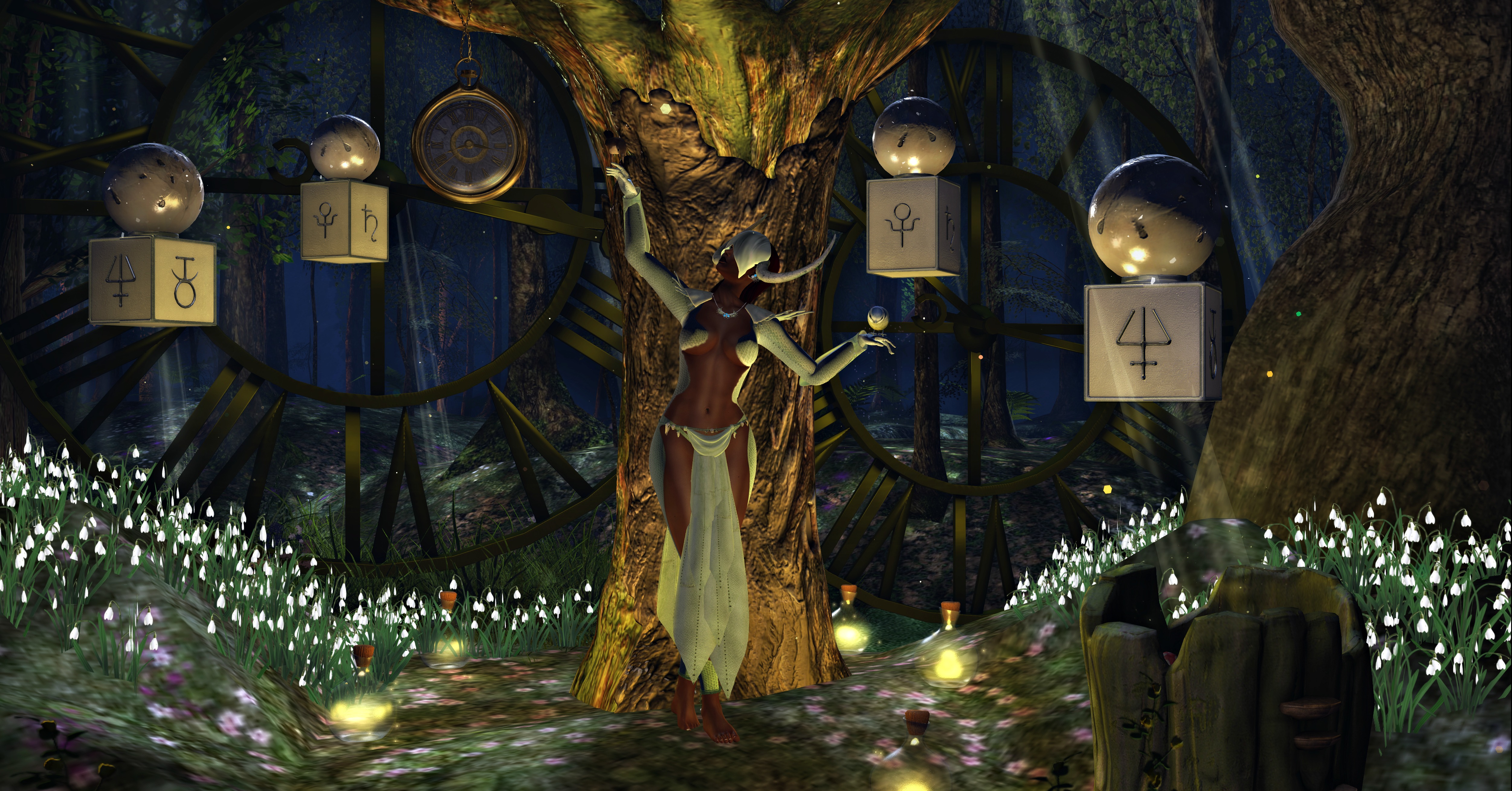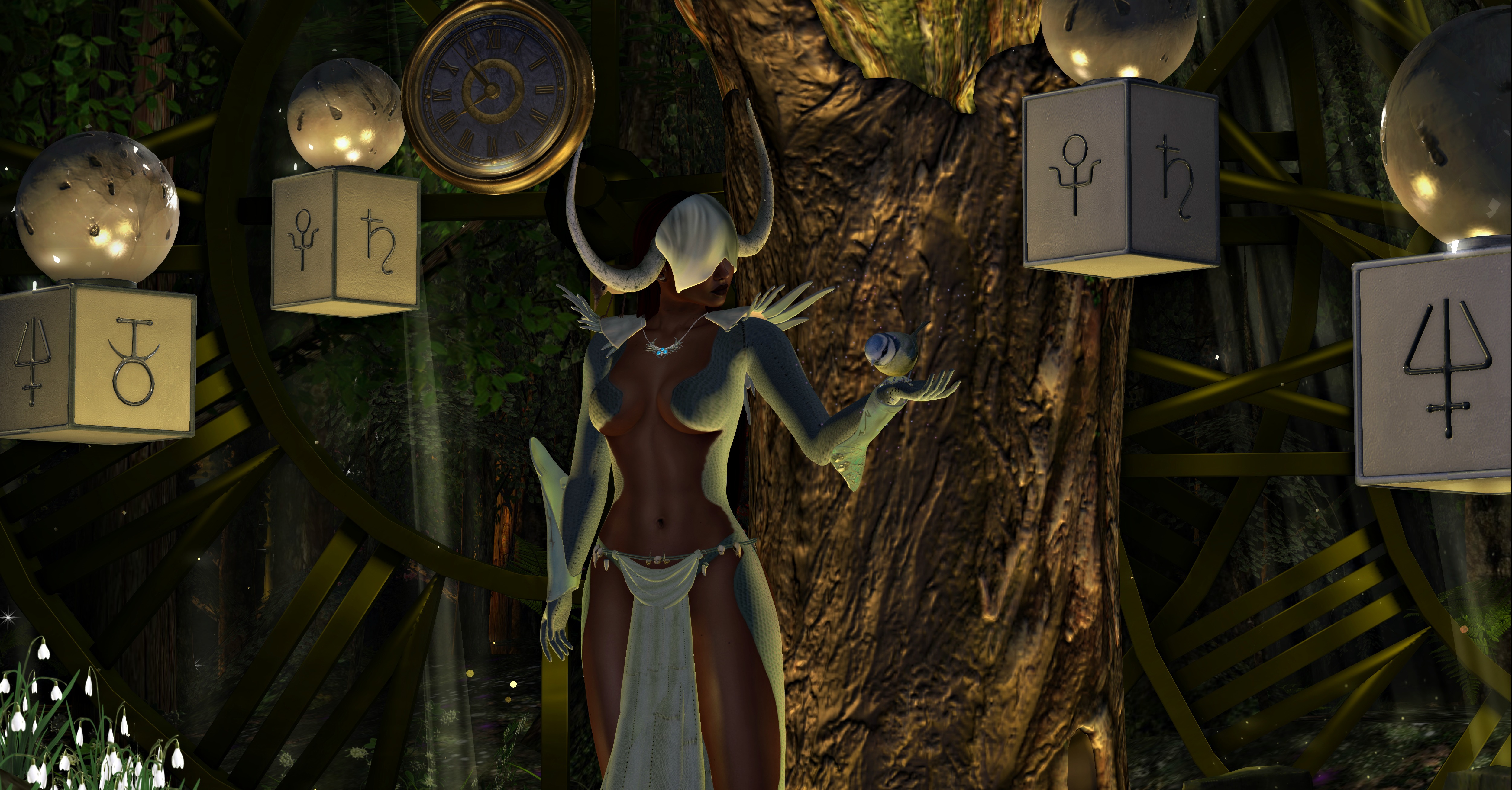 Other cool items you will find in my photos: The Fairy Bath Stump by Dysfunctionality. I picked it up for 50 Lindens during 50 Linden Friday. If you’re looking for some amazing fantasy decor items, Dysfunctionality has PLENTY! Also, when I saw the Moon Witch Elemental Plinth by Plastik, I knew I had to have it for this scene! Neither Plastik nor Dysfunctionality are sponsors, but you’ll want to check them out if you love to do fantasy photos.